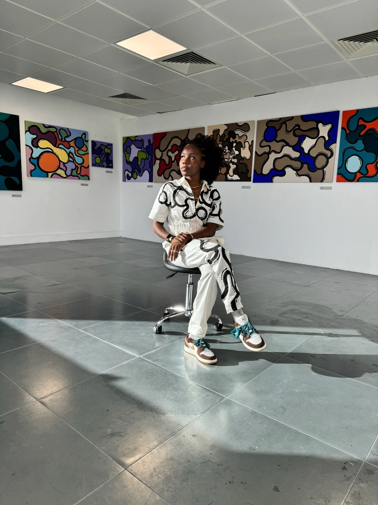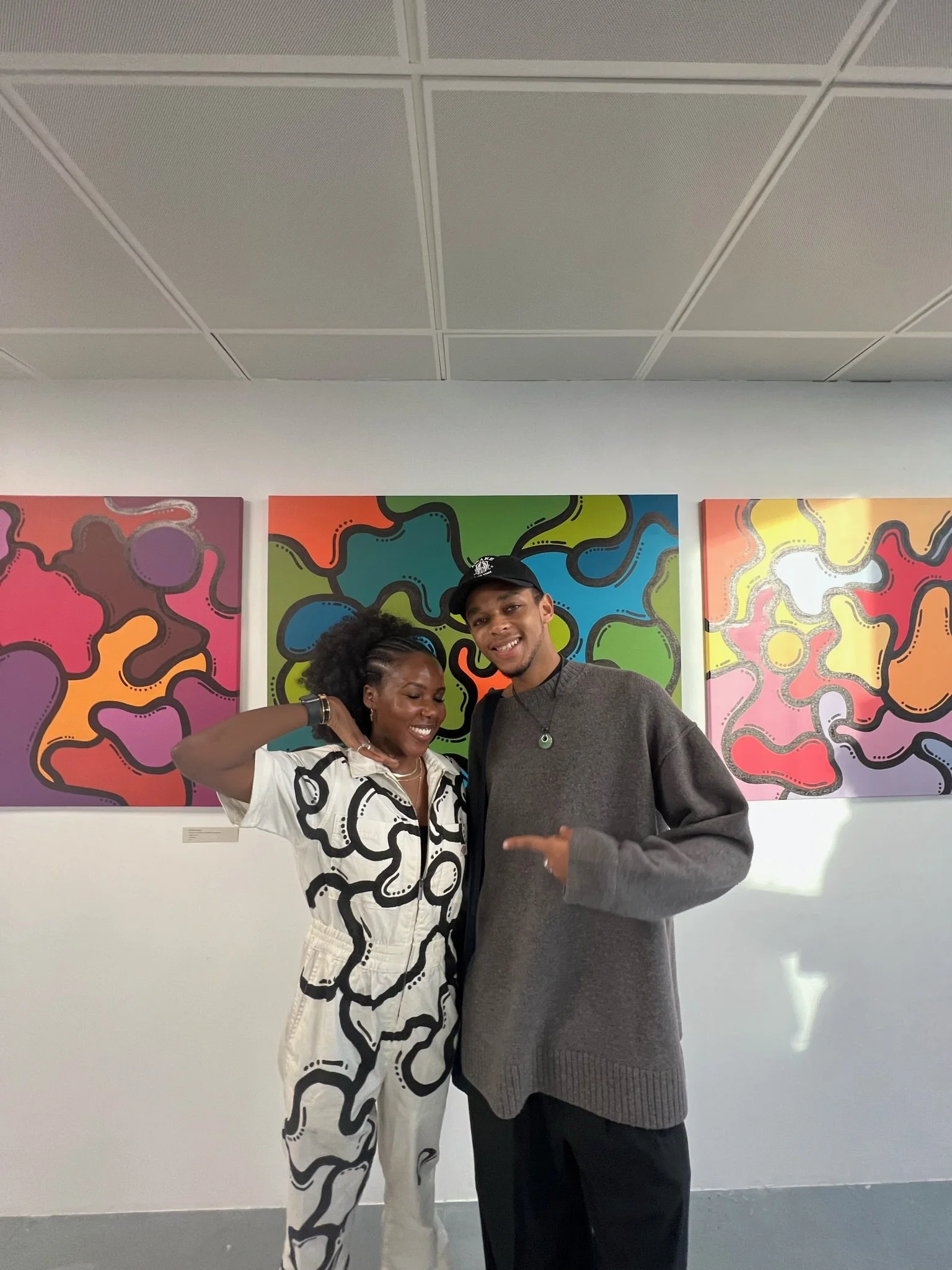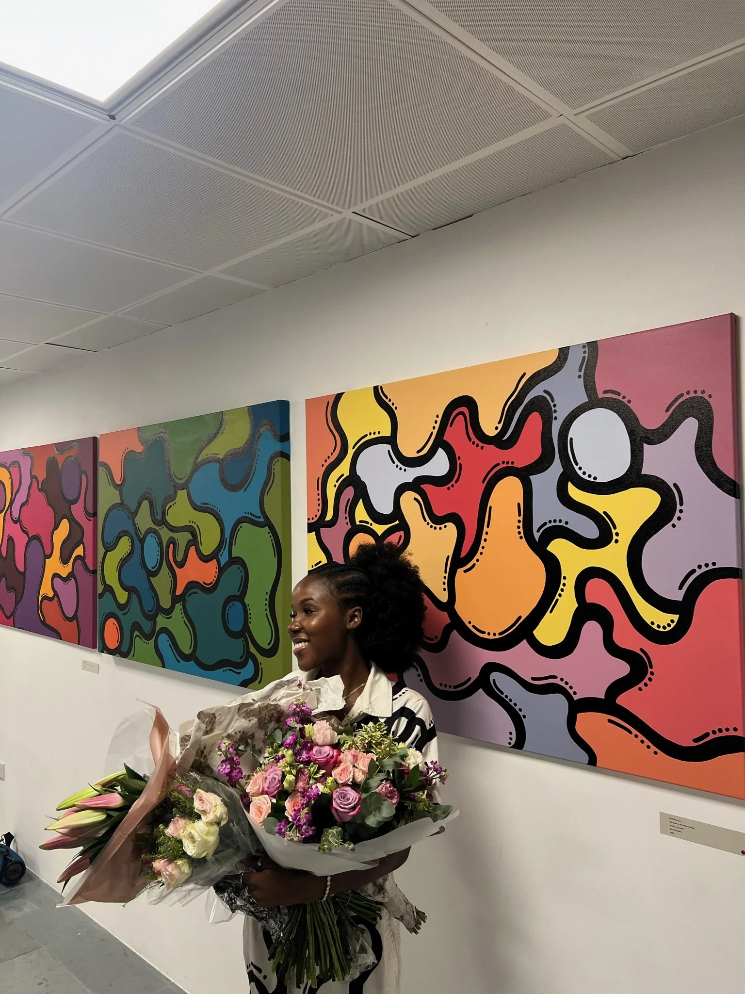 This collection consists of 14 new abstract paintings composed with acrylic on cotton canvas. Each piece is an explosion of vibrant colours that immediately capture the eye. Featuring distinctively marked coloured shapes, with unique combinations of hues and shades that appear to float and blend into one another in a harmonious dance.